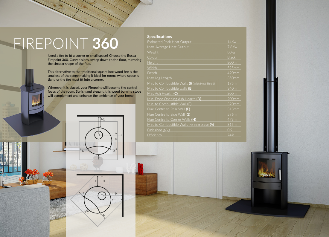 The BOSCA Firepoint 360 wood burning fire is small in size, but big on heat and style. With elegant, curved sides and European styling, the 360 enhances the ambience of any room. This aesthetically beautiful fireplace has the smallest footprint & dimensions of all the Bosca log burners. The curved sides allow the fire to fit where space is tight or corner placement is required. The 14kW output is perfect for heating small to average sized homes and features a built in ash pan. There is also no need for an expensive insulated hearth, all Bosca fires only require an ash hearth.